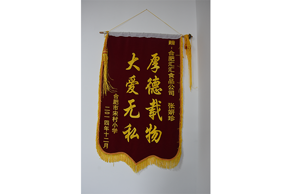 安徽匯匯食品有限公司董事長張妍珍女士愛心捐贈合肥市宋村小學(xué),獲宋村小學(xué)贈送“厚德載物,大愛無私”錦旗。
